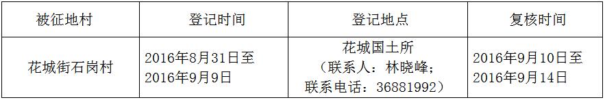 经省人民政府批准(粤国土资(建)字〔2016〕183号文),需将广州市成人直播 花城街石岗村属下的集体土地4.2898公顷(合64.3470亩)征收为国有土地。现将经依法批准的《征收土地方案》和市人民政府批准的《征地补偿安置方案》内容以及有关事项公告如下: