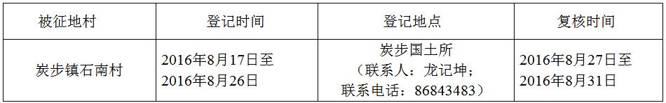 五、被征收土地四至范围内的土地所有权人、使用权人在本公告规定的期限内,持土地权属证书或其他有关证明材料,到指定的地点办理征地补偿登记,请互相转告。