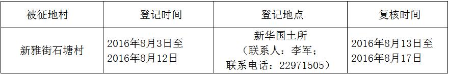 经省人民政府批准(粤国土资(建)字〔2016〕281号文),需将广州市成人直播 新雅街石塘村属下的集体土地2.3862公顷(合35.79亩)征收为国有土地。现将经依法批准的《征收土地方案》和市人民政府批准的《征地补偿安置方案》内容以及有关事项公告如下: