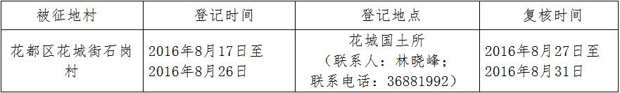 经省人民政府批准(粤国土资(建)字[2016]426号文),需将广州市成人直播 花城街石岗村属下的集体土地8.7115公顷(合130.6725亩)征收为国有土地。现将经依法批准的《征收土地方案》和市人民政府批准的《征地补偿安置方案》内容和有关事项公告如下: